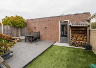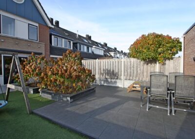 De zonnige achtertuin is is ingericht met fraaie bloembakken, kunstgras gazon en een heerlijk terras. Achterin de tuin bevindt zich de ruime, uitgebouwde garage van 34,1 m² groot. Een prachtige en grotendeels geïsoleerde ruimte voor werken aan huis of uitgebreide hobby, welke is voorzien van een lichtkoepel in het dak, automatische (sectional) garagedeur, separate loopdeur en betonnen epoxy vloer.
