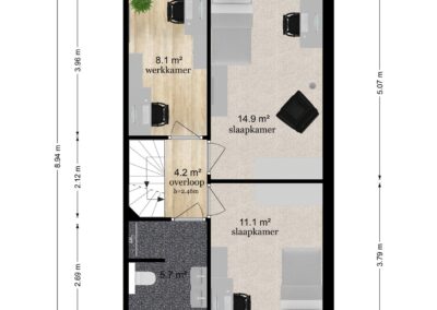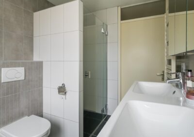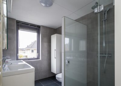 Overloop, aan de achterzijde van de woning bevinden 2 slaapkamers van 14,9 m² en 8,1 m² en aan de voorzijde de 3e slaapkamer van 11,1 m². Moderne badkamer, volledig betegeld en voorzien van een inloopdouche, toilet, dubbele wastafel en een designradiator.