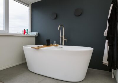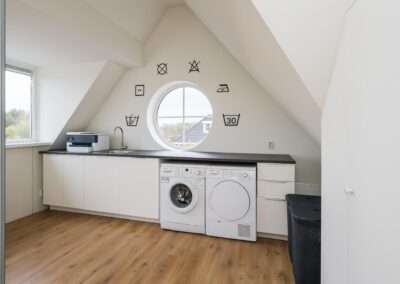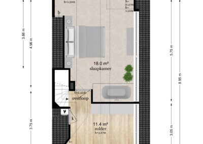 Vaste trap, ruime overloop met c.v.-opstelling en ruimte voor de wasmachine en de droger. Royale zolderslaapkamer van 18 m² met brede dakkapel (voorzien van rolluiken), inbouwspots, eigen vrijstaand ligbad en een airco.