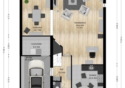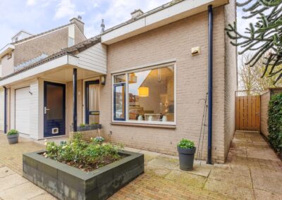 Begane grond: Parkeergelegenheid voor 2 auto’s op eigen terrein, inpandige garage van 16 m² met een op afstand te bedienen sectionaaldeur, loopdeur aan de voorzijde en aansluitend een bijkeuken van 6m².