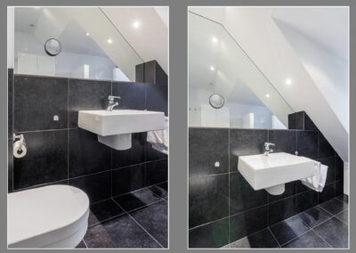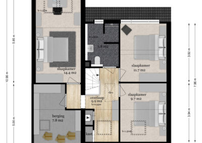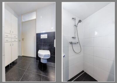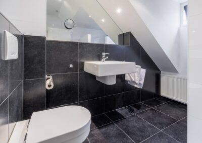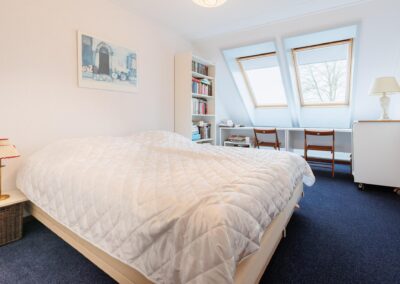 1e Verdieping: Ruime overloop met Velux dakvenster, vaste kast met opstelling CV-combiketel en mechanische ventilatie, vlizotrap naar bergvliering. Vanaf de overloop zijn er 3 slaapkamers te bereiken van 18,12 en 12 m². De fraaie badkamer is ingericht met een ruime inloopdouche, hangend toilet en wastafel met grote spiegel en ingebouwde spots. Separaat boven de garage is een ruime bergkamer aanwezig van bijna 8 m² met Velux dakvenster. Deze ruimte is geschikt te maken als extra (4e) slaapkamer.