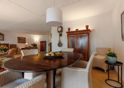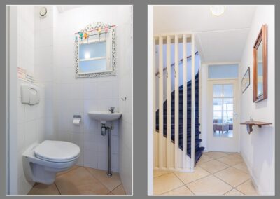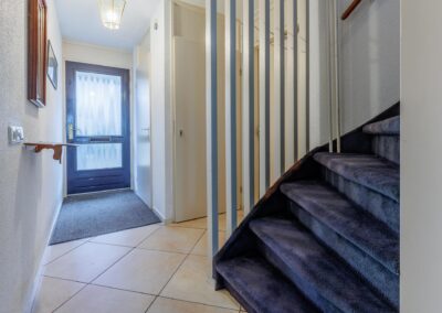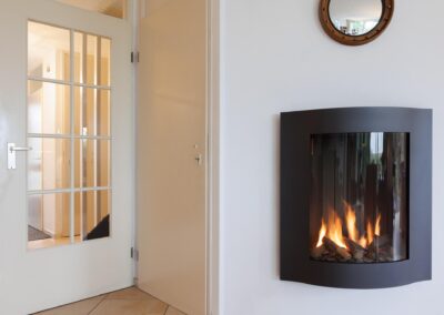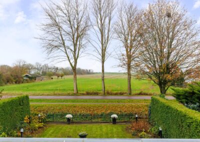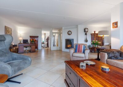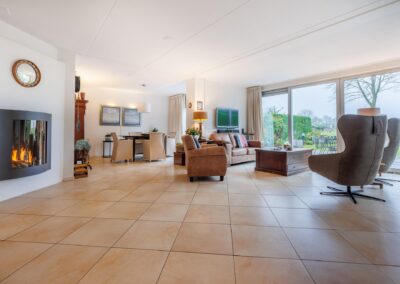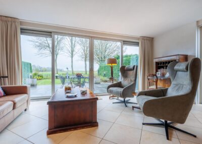ENTREE, moderne toiletruimte betegeld, hangend toilet en fontein, meterkast, trapopgang, toegang tot een uitgebouwde living van 55 m². Deze prachtige leefruimte is ingericht met een sfeervolle gashaard (DRU), lichte wanden, plavuizen vloer met vloerverwarming en twee grote raampartijen met zicht over de weilanden.