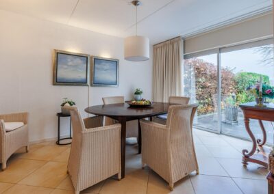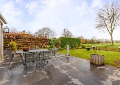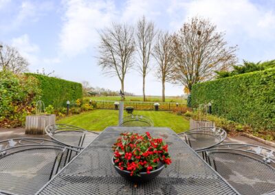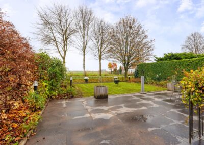 Vanuit de woonkamer is met twee schuifpuien de grote tuin te bereiken gunstig gelegen op het zuiden. De tuin is fraai aangelegd en beschikt over een zonneterras, gazon, heesters en tuinverlichting. Vanuit de tuin is er vrij uitzicht over de weilanden. Via eigen achterom kan je naar de voorkant van het huis.