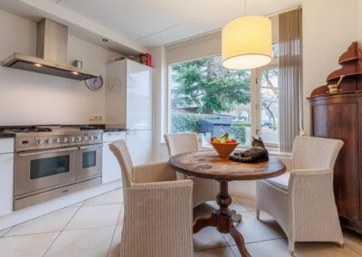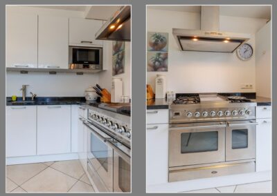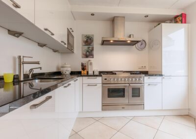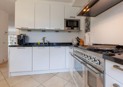 De semi-open keuken aan de voorzijde 10 m² is voorzien van een stenen aanrechtblad, vaatwasser, magnetron, koelkast, Boretti gasfornuis met heteluchtoven en afzuigkap.
