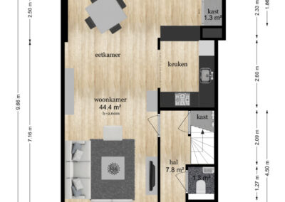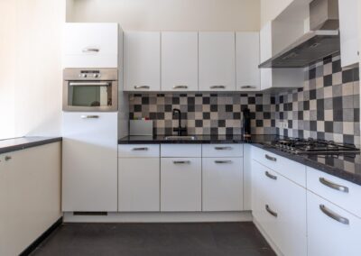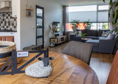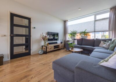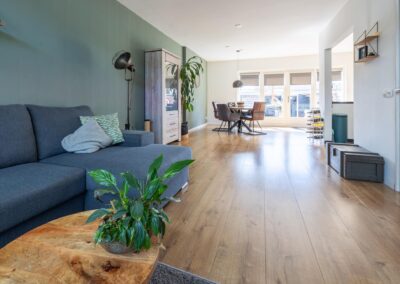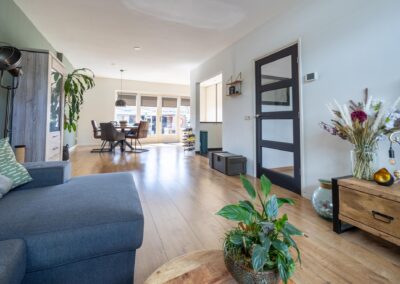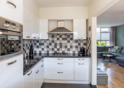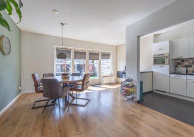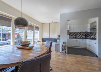 Door de grote raampartijen aan zowel de voor- als achterkant van de woning maakt het een lichte doorzonkamer. Aansluitend bevindt zich de open keuken voorzien van o.a. inbouwapparatuur, een kokend-water kraan en bergingsruimte. Er is ook nog een extra separate, ruime voorraadkast met schuifdeuren aanwezig in de aanbouw achter.