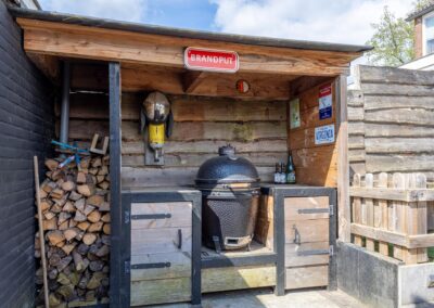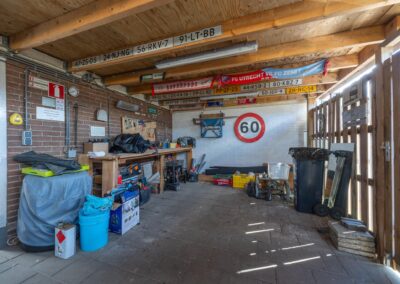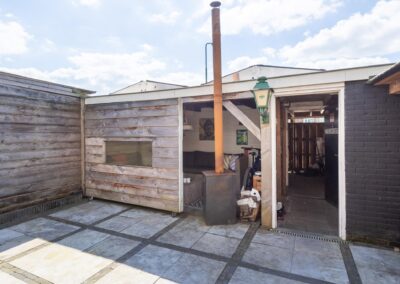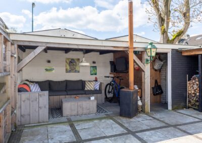 Het is heerlijk vertoeven in de achtertuin op het zuiden, maar er zijn ook schaduwplekken gecreëerd, zoals een grote overkapping die zelfs afgesloten kan worden, zodat je lekker beschut uit de wind kan zitten. Aansluitend een berging voorzien van elektra. Met wat aanpassingen zou het ook mogelijk zijn om een carport of (dubbele) garage te realiseren (vraag voor mogelijkheden dit na bij de gemeente) .