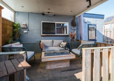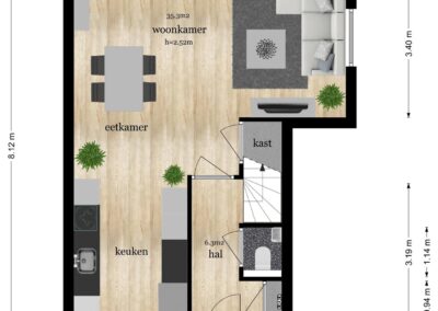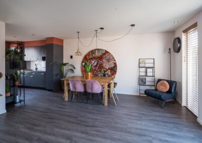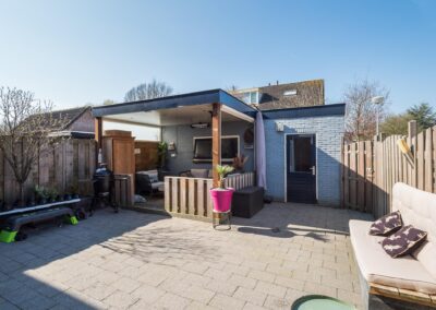 Begane grond: ENTREE met meterkast en toiletruimte, toegang tot de uitgebouwde woonkamer voorzien van openslaande deuren naar de achtertuin, moderne open keuken met diverse inbouwapparatuur waaronder een inductiekookplaat, koel-/ vriescombinatie, combi-oven en een vaatwasser. De woonkamer en keuken zijn samen ruim 35m² goot en de gehele begane grondvloer is voorzien van een pvc-vloer met vloerverwarming en glad gestucte wanden en plafonds. De zonnige achtertuin ligt op het westen en is extra breed door de hekligging van de woning. Het is ingericht met een terras en een gezellige veranda met een zitje en is zeer onderhoudsvriendelijk. Vanuit de tuin is de garage bereikbaar. De garage is 2.91 x 6.12m groot en voorzien van een wasbak, plavuizenvloer en heeft een loopdeur naar de tuin.