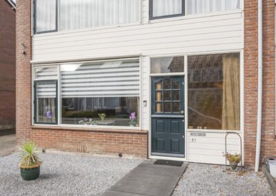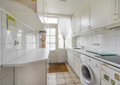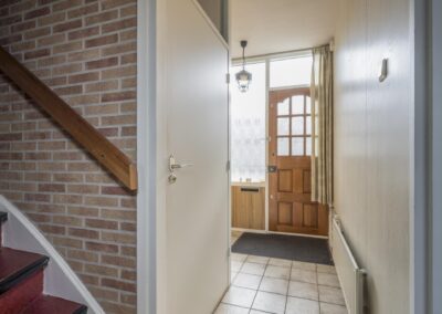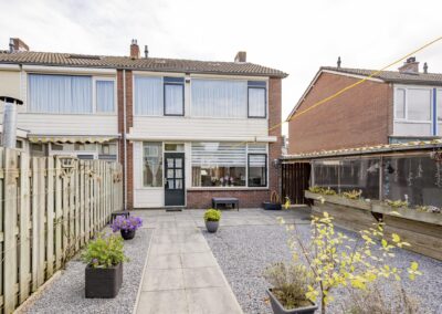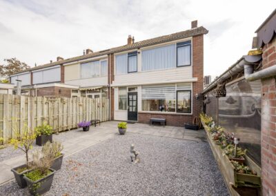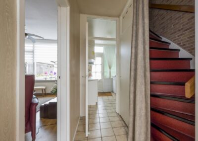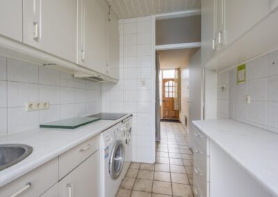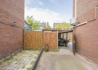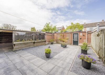 Begane grond: Bij binnenkomst in de hal vindt u een garderoberuimte, een deels betegeld toilet, de meterkast en de trap naar de bovenverdiepingen. Vanuit de hal komt u in de lichte doorzonwoonkamer voorzien van airco, aangrenzend de keuken. De woonkamer geniet van veel daglicht door de grote ramen. De dichte keuken is voorzien van een keukenblok. Vanuit de keuken heeft u toegang tot de volledig betegelde achtertuin, die is voorzien van beplante borders en een stenen berging met elektra over de volle breedte van de tuin. Daarnaast beschikt u over een eigen achterom, ideaal voor het stallen van fietsen.