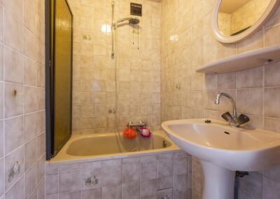 1e verdieping: Aan de achterzijde van de eerste verdieping bevinden zich twee slaapkamers, waarvan één met een inbouwkast en boiler. Aan de voorzijde zijn eveneens twee slaapkamers, inclusief de ouderslaapkamer met een inbouwkast. De badkamer is gesitueerd tussen de twee grote slaapkamers in en is volledig betegeld, beschikt over een douche met zitbad en wastafel.