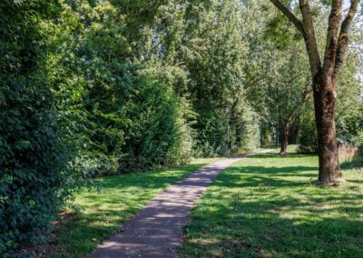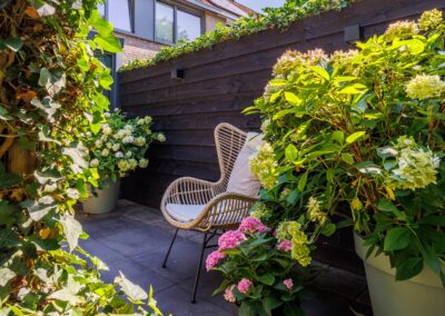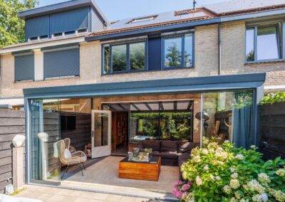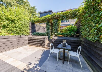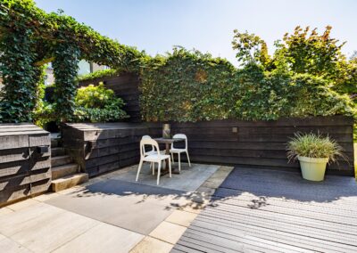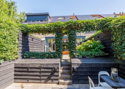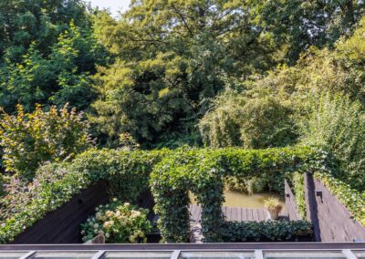De tuin is een waar verlengstuk van de woonkamer dankzij de royale serre annex tuinkamer, die volledig kan worden afgesloten met schuifdeuren. Verder is de tuin speels ingedeeld met meerdere terrassen, een jacuzzi en een groene pergola die leidt naar het lagergelegen deel van de tuin, direct aan het water. Hier geniet je volop privacy, midden in de woonwijk.