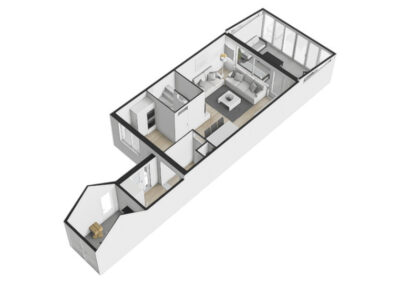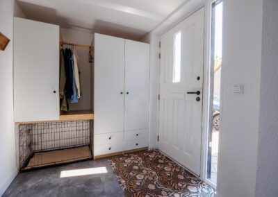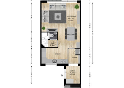 Entree met hal en meterkast. Vanuit hier stap je de royale woonkamer van ca. 34,2 m² binnen. In het hart van de kamer ligt het eetgedeelte met ruimte voor een grote eettafel. Dankzij de open keuken blijf je in contact met je gasten. De beneden verdieping is voorzien van vloerverwarming en er is een kruipruimte-/vloerisolatie gedaan.