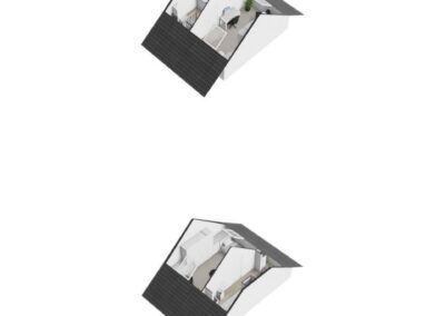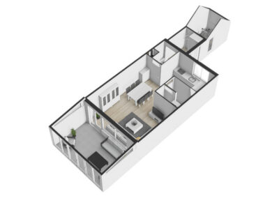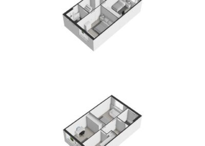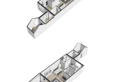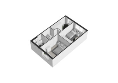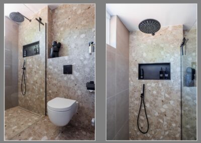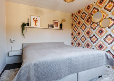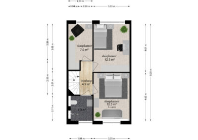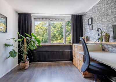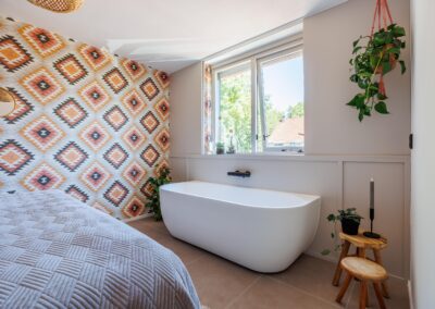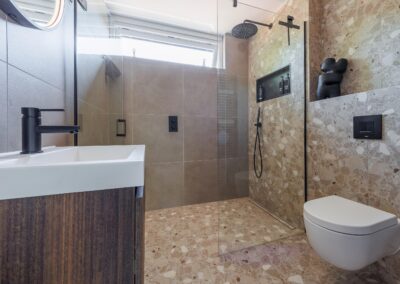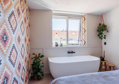 Overloop met drie slaapkamers van ca. 7,0 m², 12,3 m² en 12,3 m². De masterbedroom is een echte eyecatcher, voorzien van een stijlvol ligbad. De badkamer is eind 2024 vernieuwd en luxe afgewerkt met beige natuursteen en zwarte details. Hier vind je een inloopdouche, wastafelmeubel en toilet.
