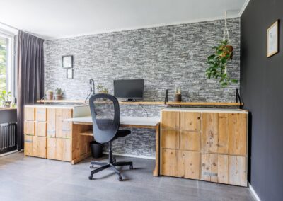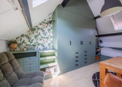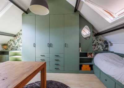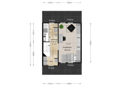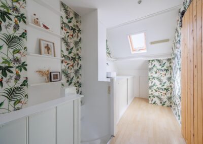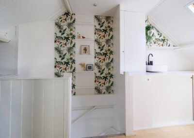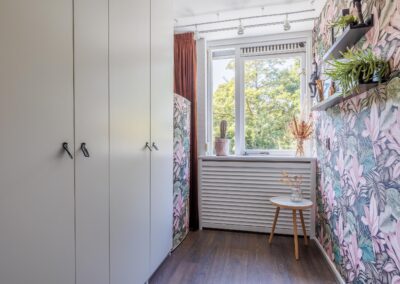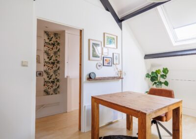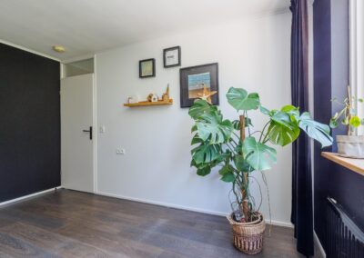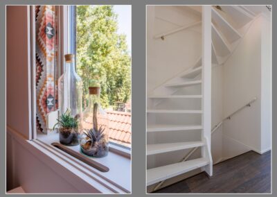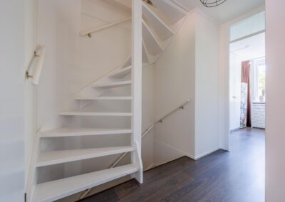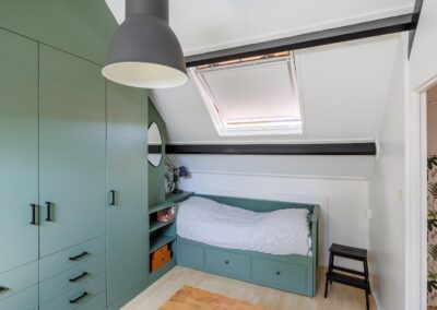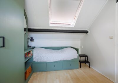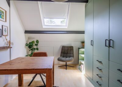 Via een vaste trap bereik je de voorzolder met praktische op maat gemaakte kasten, een witgoedopstelling, wastafel en knieschotten voor extra bergruimte. Hier bevindt zich tevens de royale vierde slaapkamer van 16,4 m² met een kastenwand op maat. De cv-ketel is ook op deze verdieping geplaatst.