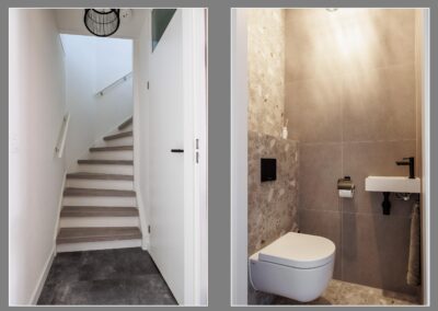 In de woonkamer bevindt zich tevens een tweede hal met trapopgang en een toiletruimte, uitgevoerd in dezelfde stijl als de badkamer.