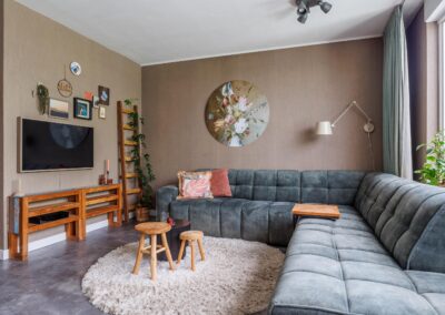 In de woonkamer bevindt zich tevens een tweede hal met trapopgang en een toiletruimte, uitgevoerd in dezelfde stijl als de badkamer.