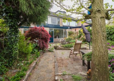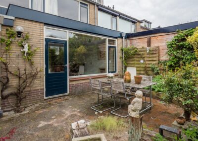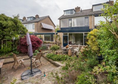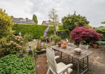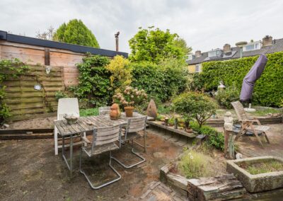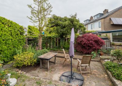 De achtertuin is te bereiken via de openslaande deur vanuit de woonkamer en is gelegen op het noordwesten. De tuin is ingericht met fijne zitplekken, borders en een achterom.