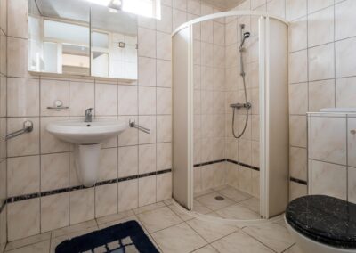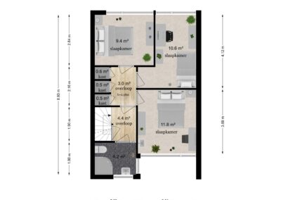 Overloop met vaste kasten en toegang tot 3 slaapkamers van circa 11,8 m², 10,6 m² en 9,4 m². De volledig betegelde badkamer van circa 4,2 m² is eenvoudig ingericht met een douche, wastafel en een 2e toilet.