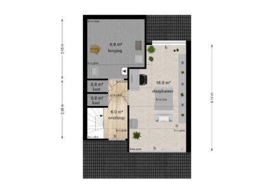 Overloop met vaste kasten en een berging van circa 8,8 m² met CV-opstelling en wasmachine-/drogeraansluiting. Toegang tot de 4e slaapkamer van circa 18,8 m².
