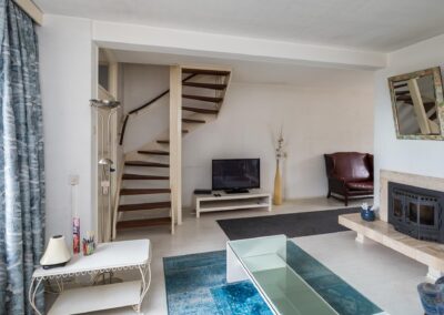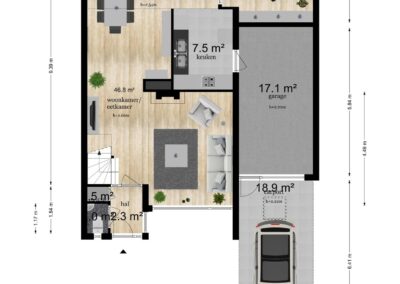 ENTREE, hal met meterkast en toiletruimte. De U-vormige woonkamer van circa 46,8 m² biedt meerdere zitplekken met een gezellige openhaard en een open trapopgang. Achter de schuifdeuren is een mogelijkheid voor een eetkamer of een kantoor van circa 10,3 m². De halfopen keuken van circa 7,5 m², is voorzien van een 4-pits gasfornuis, afzuigkap, oven en een koelkast. Vanuit de keuken is er toegang tot de ruime garage van circa 17,1 m².