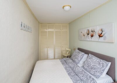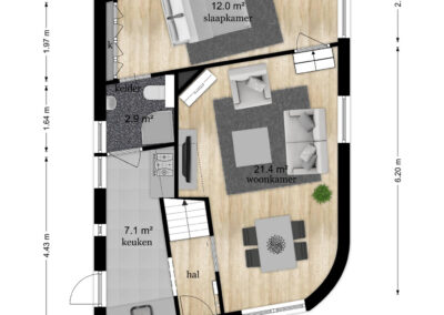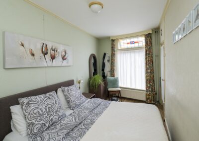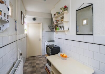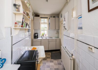 ENTREE, hal met trapopgang. De sfeervolle en charmante woonkamer is 21,4 m² groot en biedt toegang tot de 1e slaapkamer van 12 m². De dichte keuken is voorzien is van een magnetron, elektrisch gasfornuis, afzuigkap, koelkast en oven. Aansluitend is de badkamer te bereiken vanuit de keuken en ingericht met douchecabine, toilet en wastafel.