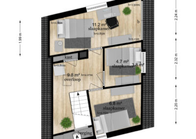 Ruime overloop met bergruimte, opstelplaats voor CV-ketel en toegang tot 3 slaapkamers van 11,2 m², 6,8 m² en 4,7 m².