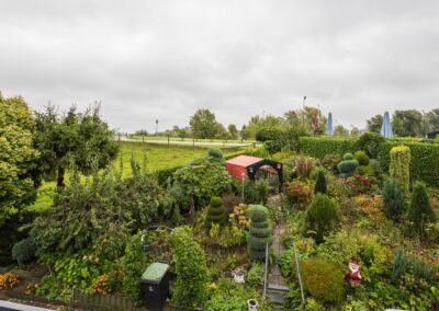 Vanuit de zijdeur in de keuken is er toegang tot de zij-/achtertuin. De tuin, hoofdzakelijk gelegen op het zuiden, is voorzien van een terras, borders met diverse beplantingen. Achterin bevindt zich een ruime garage van 30,8 m² groot, voorzien van elektra. Naast vanuit huis en vanuit de tuin is een prachtig uitzicht op de naastgelegen wal, eigendom van de gemeente, welke is ingericht als sier-/moestuin.