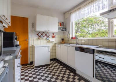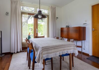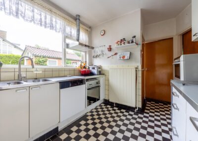 Wanneer u de woning binnenstapt valt het gelijk op dat de velen raampartijen de woonkamer een licht geheel maken. Aan de voorzijde vind u de woonkamer met aansluitend een eetgedeelte. De keuken heeft uitzicht op de achtertuin. Daarnaast bevindt zich een bijkeuken.