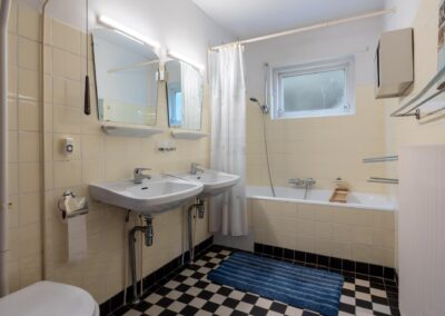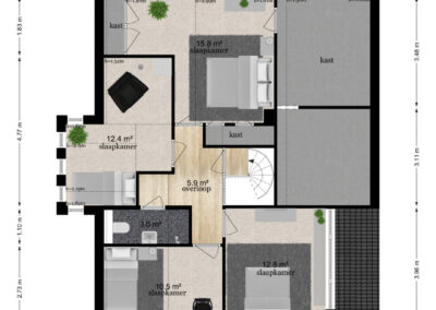 Overloop met toegang tot 4 slaapkamers. Één van de slaapkamers is voorzien van airconditioning. Op deze etage bevindt de badkamer uitgerust met een wastafel, douche en toilet.