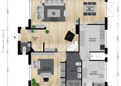 De woning heeft een woonoppervlakte van 166 m2, verdeeld over 2 woonlagen met in totaal 4 slaapkamers, maar er is op de begane grond ook een mogelijkheid een 5e slaapkamer te creëren in de ruimte die nu als werkkamer gebruikt wordt. De werkkamer heeft een eigen ingang. Tevens is er een badkamer op de begane grond én op de 1e verdieping, wat dit een levensloopbestendige woning maakt!