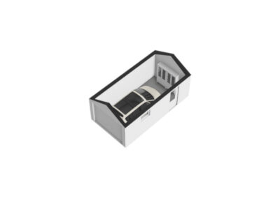 Vrijstaande stenen berging met elektrische roldeur, geïsoleerd en uitgerust met elektra.