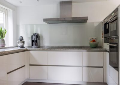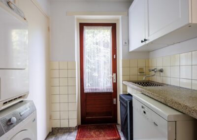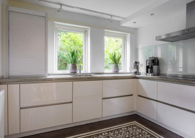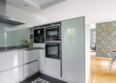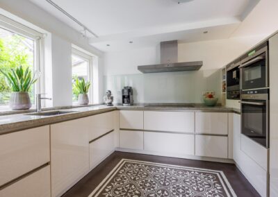 – Volledig moderne inbouwkeuken geplaatst van het merk SieMatic, voorzien van Siemens inbouwapparatuur zoals een oven, combi-oven, magnetron, inductiekookplaat, afzuigkap, vaatwasser, koelkast, inbouw espresso volautomaat koffieapparaat, bordenwarmer, veel kastruimte en een stenen blad.