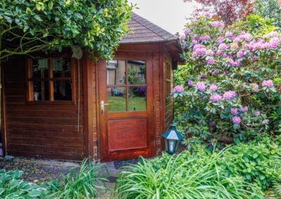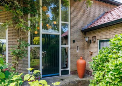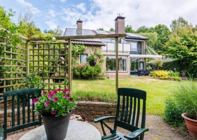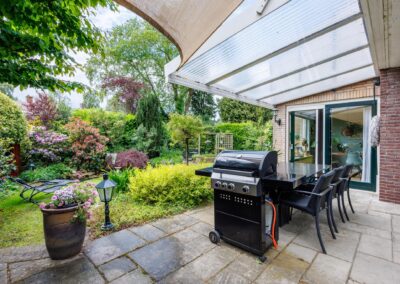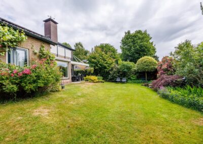 De woning is mooi gesitueerd op het ruime kavel met een tuin rondom! Zowel aan voor- als aan achterzijde is de tuin diep. De achtertuin is gelegen op het zonnige zuidwesten, fraai aangelegd en voorzien van meerdere terrassen, waarvan 1 terras aan het huis met overkapping. De tuin is verder ingericht met gazon en een grote diversiteit aan heesters, bomen en bloemen. Kortom een oase van groen met een zeer zonnige ligging! Achterin staat nog een charmante vrijstaande houten berging en een terras in de schaduw.