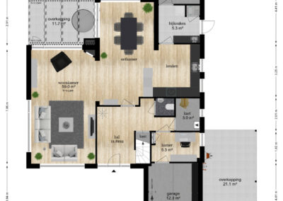 Begane grond: ENTREE in ruime ontvangsthal met grote raampartij en vide, waarbij de natuurstenen vloer van buiten doorloopt in de hal binnen. De hal heeft een trapopgang naar de verdieping, een toiletruimte en een garderobe. Vanuit de hal toegang tot een heerlijk lichte living van 59 m², welk aan de achterzijde is uitgebouwd. De living is voorzien van grote raampartij aan voor-, zij en achterzijde voor mooie lichtinval en vrij uitzicht op de tuin. Voor de winterse dagen is een een sfeervolle open haard aanwezig en de ruimte bevloerd met een prachtige visgraat eiken parketvloer. In half open verbinding met de living is de stijlvolle en luxe inbouwkeuken gesitueerd. Deze zeer uitgebreide U-vormige keuken is voorzien van alle gemakken en uitgevoerd in hoogglans wit met stenen blad, inbouwspots en sfeervolle Portugese tegelvloer. In de bijkeuken staat de vaatwasser en de aansluitingen voor uw wasmachine en droger. Achter de bijkeuken is een berging met toegang tot de tuin. De garage van 12.3 m² aan de voorzijde van het huis heeft een elektrische bedienbare sectional garagedeur en is tevens inpandig vanuit de hal bereikbaar.