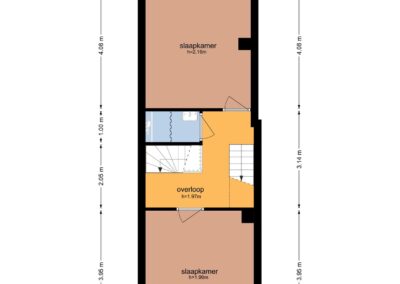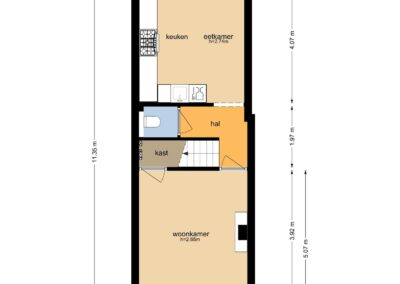 – Het totale perceel is circa 109 m² waarvan het voorste gedeelte van de voortuin, circa 14 m², nog door verkoper juridisch in eigendom worden verkregen.