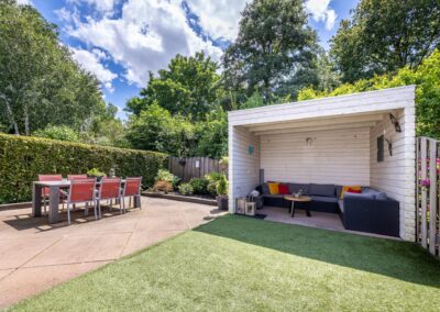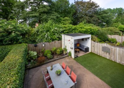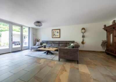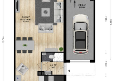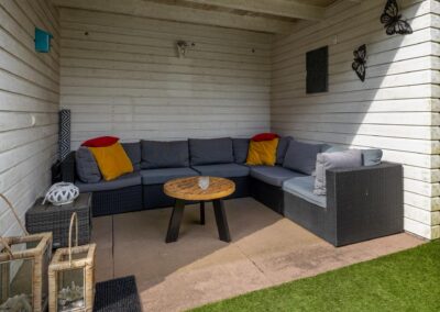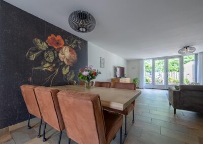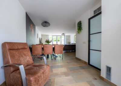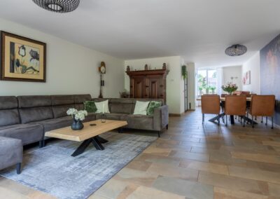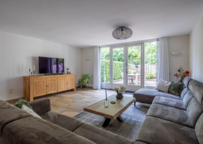 ENTREE, hal, meterkast, modern hangend closet met fonteintje en trap naar de eerste verdieping. Vanuit de hal is er toegang naar de royale woonkamer met een grote uitbouw. De royale woonkamer is 55,3 m² en heeft veel lichtinval door de openslaande deuren die toegang geven tot de ruime achtertuin. De woonkamer heeft een openkeuken in een hoekopstelling en is voorzien van diverse apparatuur waaronder een combioven/magnetron, inductieplaat en koelkast. De achtertuin is gelegen op het zuidwesten en voorzien van een fraaie tegel op het terras en een stuk kunstgras aangesloten met een gezellige overkapping waar je al vroeg in het voorjaar tot laat in het najaar heerlijk kunt genieten van de ruime tuin.