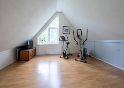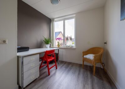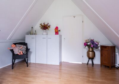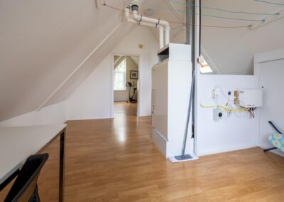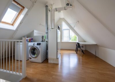 Voorzolder met wasmachine opstelling en ruimte voor eventuele werkkamer en deur naar nog een ruime slaapkamer van 12,6 m².
