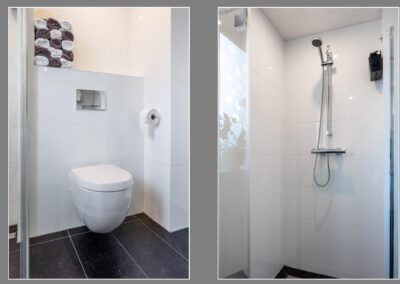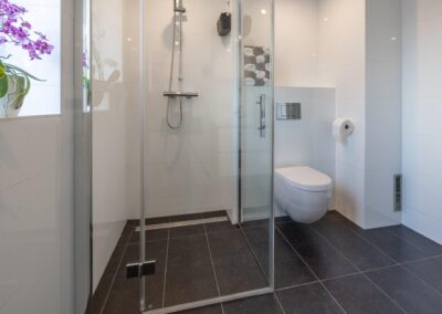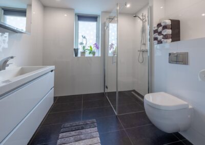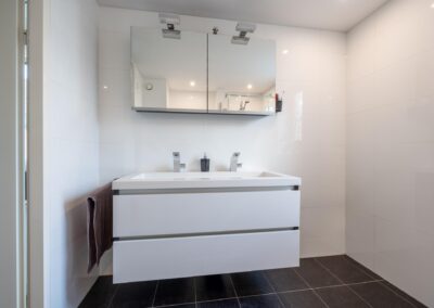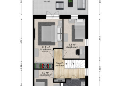 overloop, badkamer voorzien van een ruime inloopdouche, wandcloset en een dubbele wastafel. 3 royale slaapkamers 2 achter (11,7 en 9,3 m²) en 1 aan de voorzijde (8 m²).