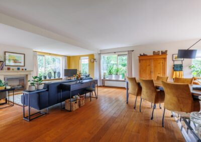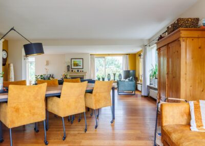 Begane grond: ENTREE, ruime hal met toiletruimte, inpandige toegang naar de garage van 23,3 m², alsmede bijkeuken met opstelling HR cv-combiketel en mogelijkheid voor plaatsen van wasmachine en droger. Vanuit de hal toegang naar de royale living en halfopen keuken. De living is over de volle breedte uitgebouwd en in totaal maar liefst 60 m² groot, ingericht met massief eiken vloer en een gashaard voorzien van stijlvolle zandstenen schouw. Door de grote ramen rondom is er goede lichtinval en mooi zicht op de tuin. De half open keuken is voorzien van inbouwapparatuur, te weten; inductiekookplaat, afzuigkap, koelkast, vaatwasser en oven.