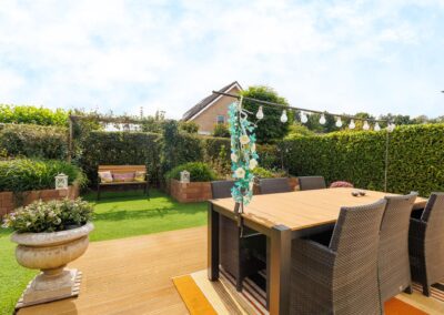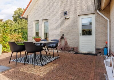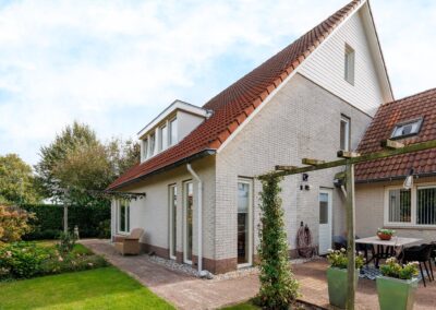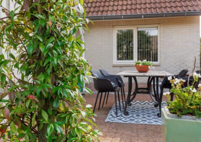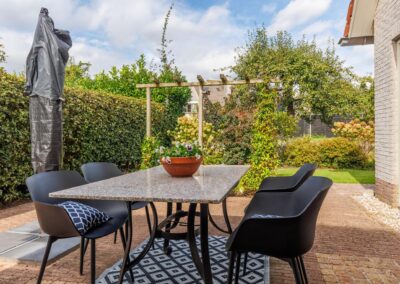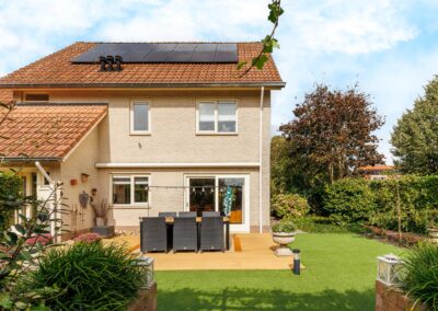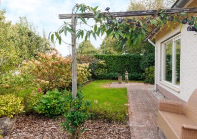 Tuin: Vanuit de living is middels een brede schuifpui toegang naar de tuin met een groot en zonnig gelegen terras uitgerust met een breed automatisch bedienbaar zonnescherm. De tuin heeft een gedeelte kunstgras wat praktisch is voor de (klein-)kinderen, maar de rest van de tuin rondom het huis is vooral ingericht met een grote variatie aan heesters, bloemen en bomen. Aan de noordzijde van het huis is een 2e terras voor de warmere dagen (schaduwrijk).