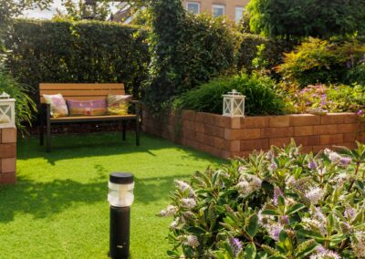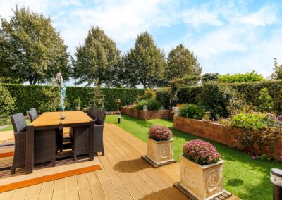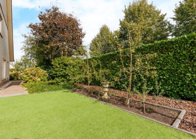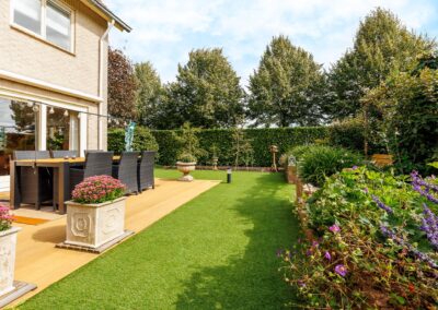 Tuin: Vanuit de living is middels een brede schuifpui toegang naar de tuin met een groot en zonnig gelegen terras uitgerust met een breed automatisch bedienbaar zonnescherm. De tuin heeft een gedeelte kunstgras wat praktisch is voor de (klein-)kinderen, maar de rest van de tuin rondom het huis is vooral ingericht met een grote variatie aan heesters, bloemen en bomen. Aan de noordzijde van het huis is een 2e terras voor de warmere dagen (schaduwrijk).