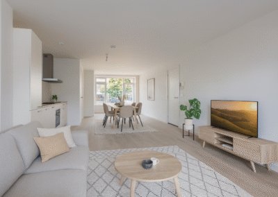 De woonkamer is zo royaal dat deze eventueel is op te delen door een 2e slaapkamer te creëren aan de voorzijde middels (glazen/vouw-/tussen)wand. Ook is er een eigen kelder aanwezig wat ingericht is als technische ruimte voor de warmtepompinstallatie. Op het dak van de garage zijn 6 zonnepanelen en een buitenunit van de warmtepomp voor het appartement geïnstalleerd.