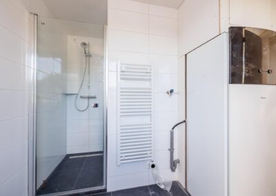 Garage voorzien van elektra. Achter de garage is een privé-parkeerplek aanwezig op het eigen terrein van het gebouw. Op het dak van de garage zijn 6 zonnepanelen en een buitenunit van de warmtepomp voor het appartement geïnstalleerd.