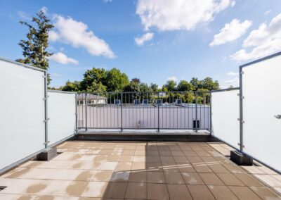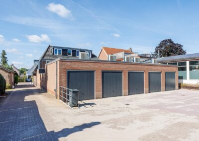 Garage voorzien van elektra. Achter de garage is een privé-parkeerplek aanwezig op het eigen terrein van het gebouw. Op het dak van de garage zijn 6 zonnepanelen en een buitenunit van de warmtepomp voor het appartement geïnstalleerd.
